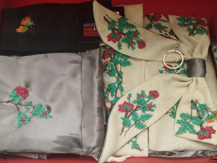 پک گلدوزی شده رز شامل روسری، مینی اسکارف،کیف و کیف ارایش،گیره پاپیون و تل پارچه ای، جوراب - ارسال رایگان،- مزون یونا