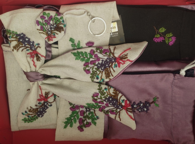 پک گلدوزی دسته گل شامل روسری،مینی اسکارف،گیره و تل،کیف و کیف آرایشی،جاکلیدی و جوراب - ارسال رایگان- مزون یونا